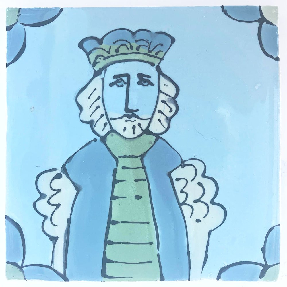 Hand made and hand decorated 140 x 140mm rustic ceramic tile. King in Sweethope with Love in The Mist, Gooseberry and Mistletoe.
