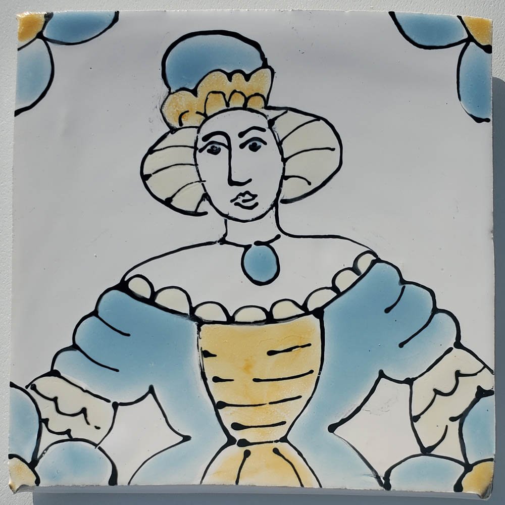 Hand made and hand decorated 140 x 140mm rustic ceramic tile. Queen in White with Love in The Mist, Saffron and Mistletoe.